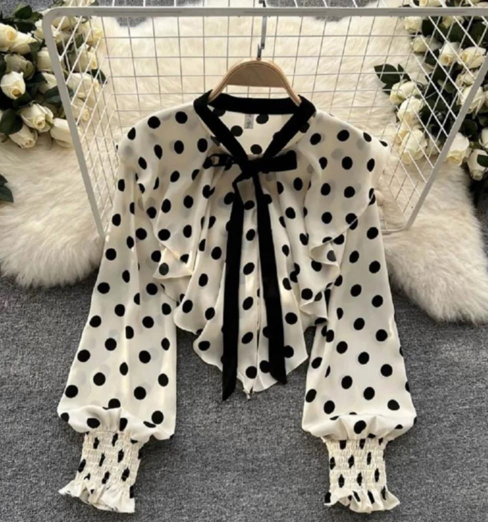 Camasa eleganta cu buline, volan amplu si maneci bufante. Perfecta pentru o tinuta smart-casual!