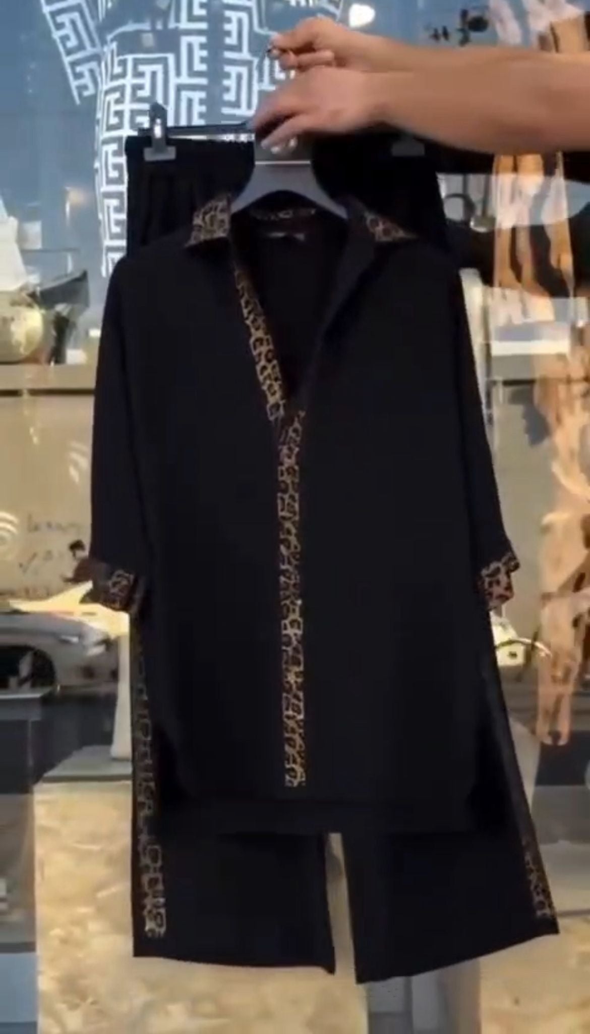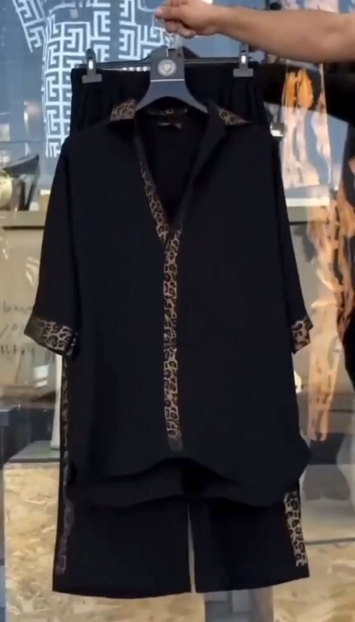 Compleu elegant cu pantalon lejer cu vipusca leopard si bluza cu detalii si guler imprimat.