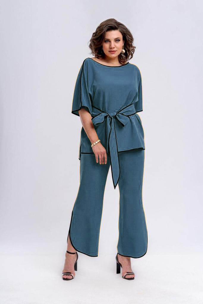 Compleu elegant, perfect pentru orice tip de eveniment. Bluza are maneca despicata si talia marcata cu un cordon, iar pantalonul este amplu despicat in laterale, cu o margine de contrast foarte fina. Vei intoarce toate privirile!