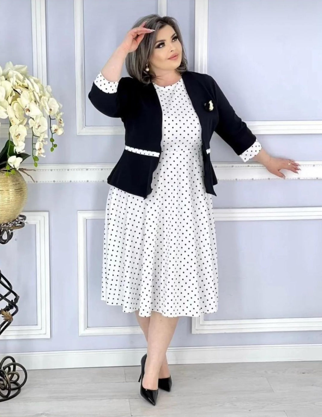 Compleu elegant din doua piese,rochie ampla si sacou cu insertie de contrast in tonul rochiei. Vei intoarce toate privirile