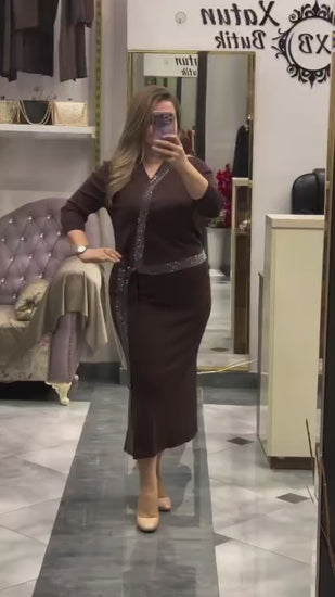 Compleu elegant din doua piese, fusta ampla midi si bluza decolteu asimetric si cordon pretios.