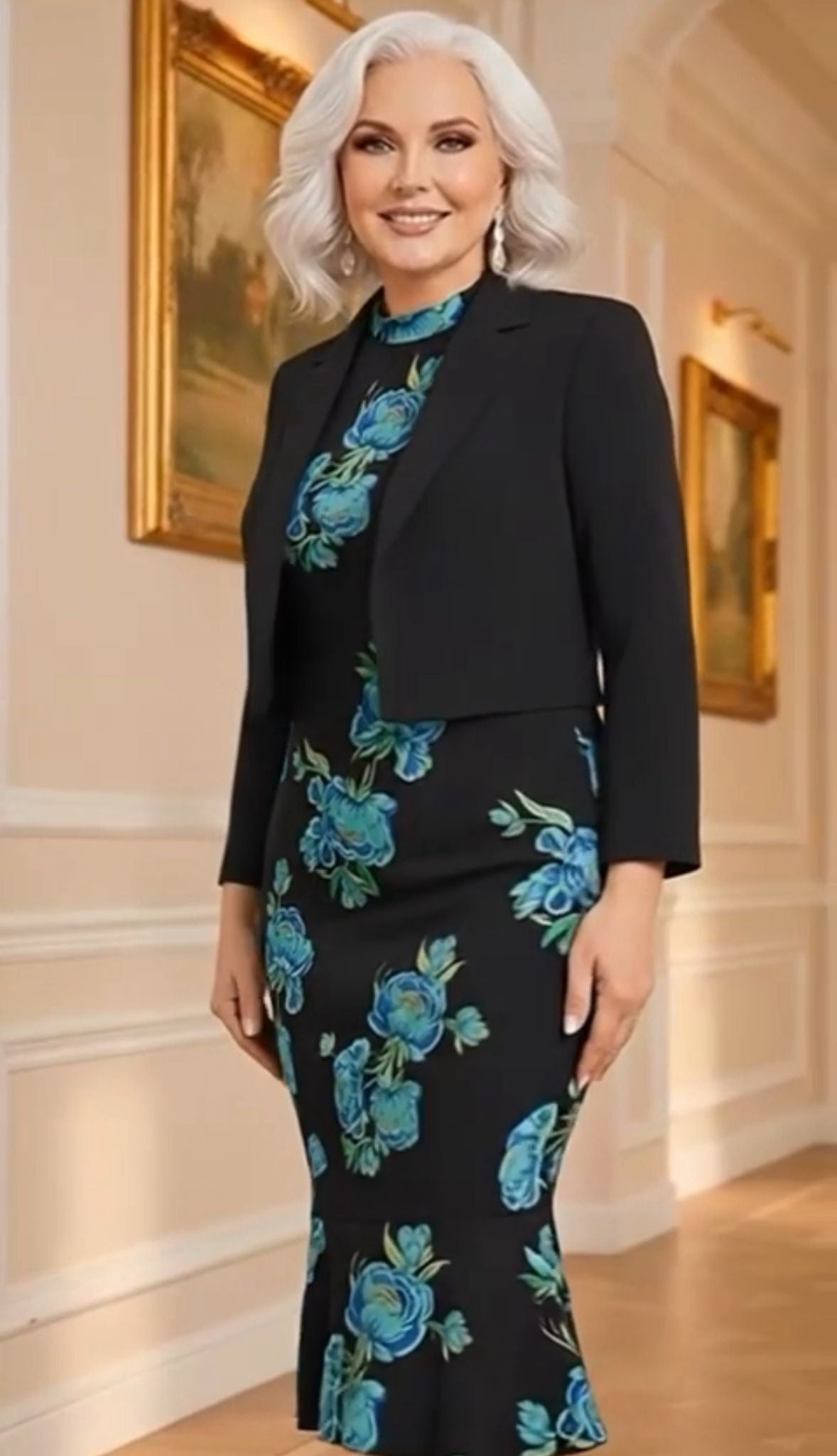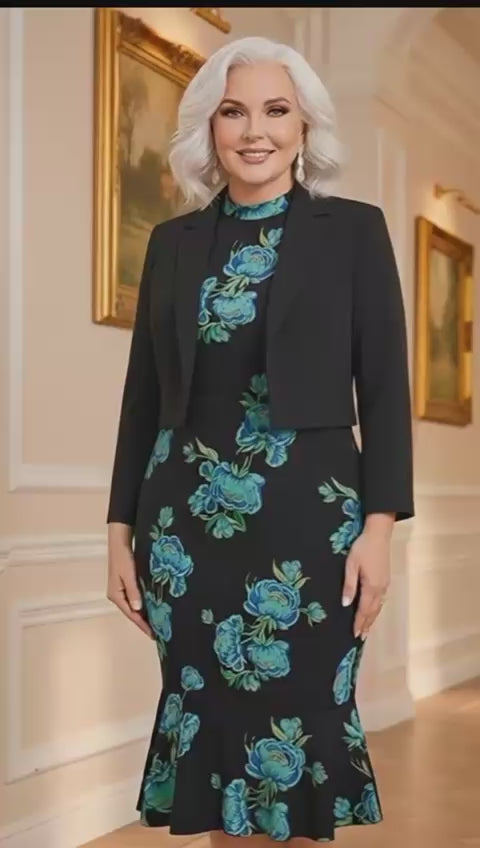 Descoperă rafinamentul unui compleu creat pentru femeia modernă care își dorește eleganță și feminitate într-o singură apariție. Setul este compus dintr-o rochie midi cambrată, cu imprimeu floral în nuanțe vibrante de albastru-turcoaz, și un sacou negru cu croială structurată, perfect adaptat pentru a completa ținuta.