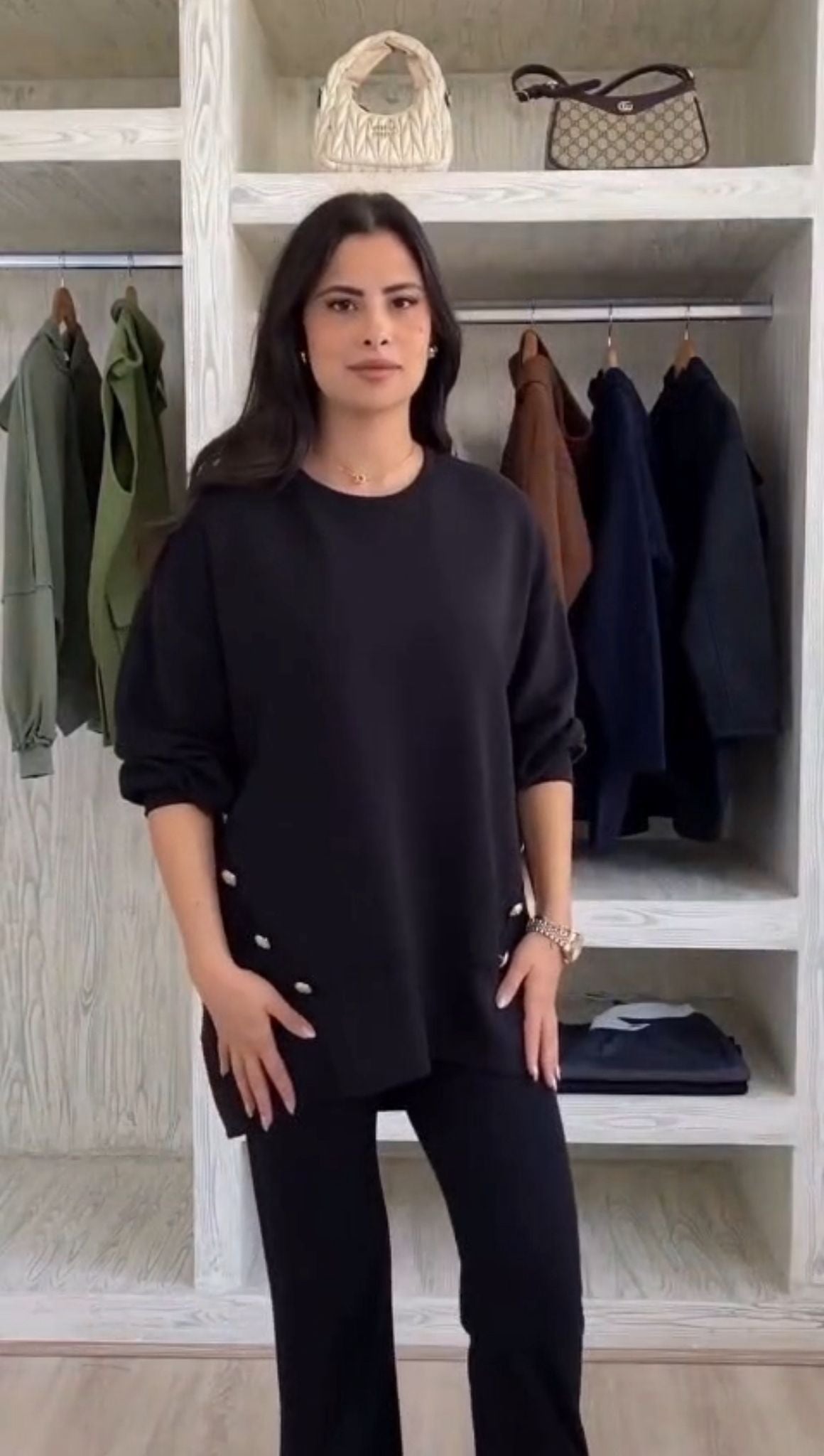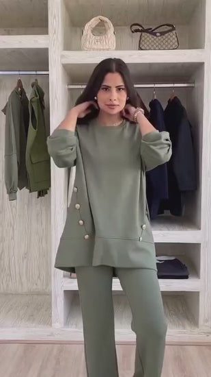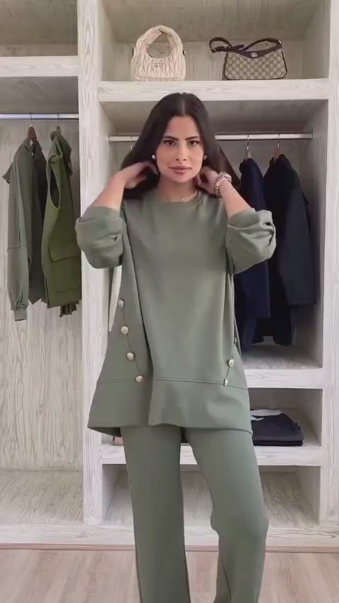 Compleu sport din doua piese, pantalon larg si bluza mai scurta in fata si mai lunga in spate. Cu nasturi de contrast atat la bluza cat si la pantalon.