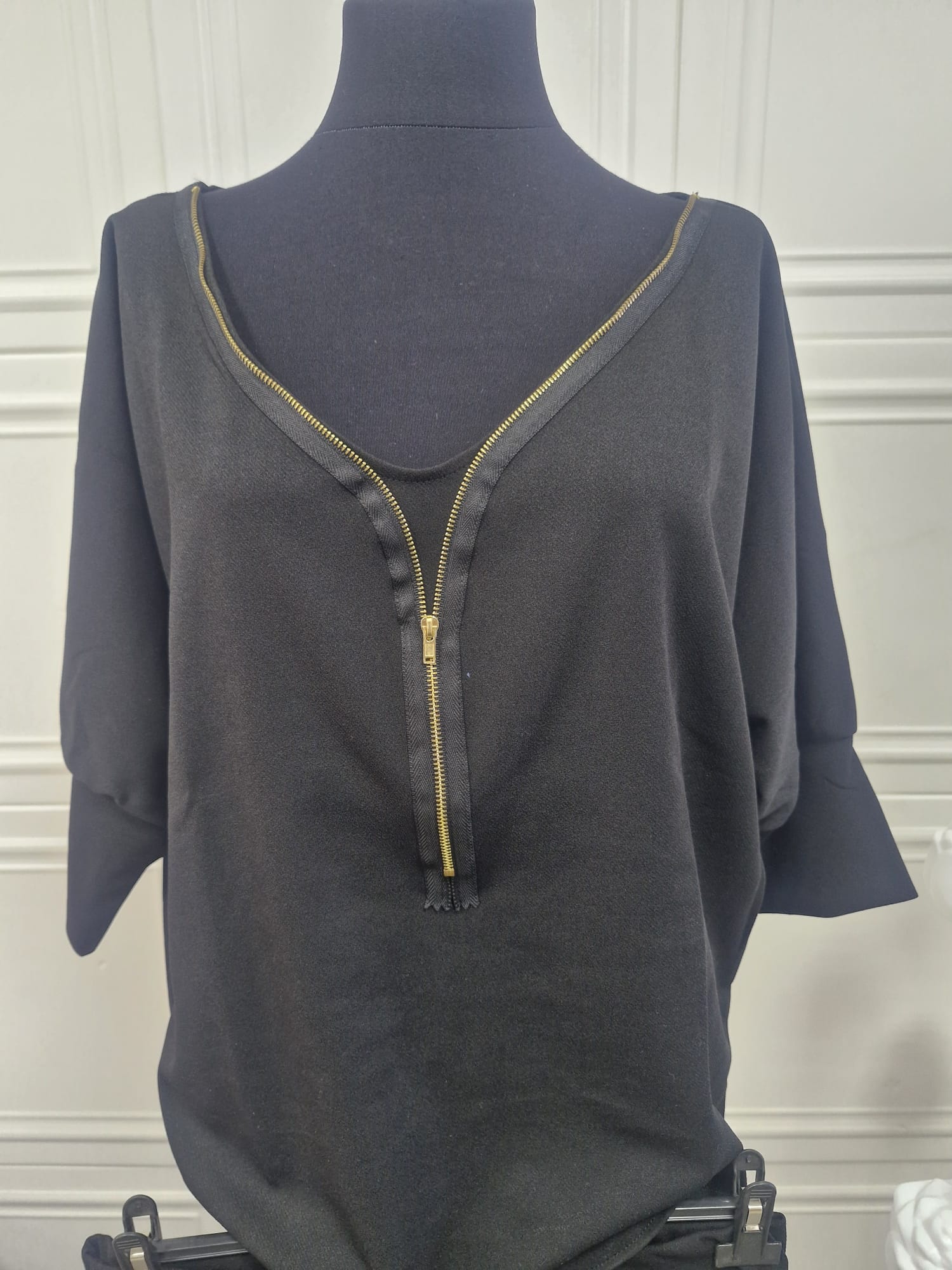 Compleu din două piese, Bluza are croi lejer, mâneci trei sferturi și un fermoar auriu decorativ în față, care permite reglarea decolteului după preferință. Pantalonii au croială conică și talie elastică, oferind confort și libertate de mișcare. Un set versatil, potrivit atât pentru ținute de zi, cât și pentru ieșiri relaxate sau întâlniri casual-elegante.