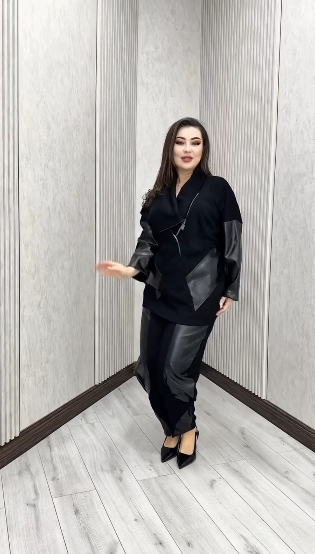 Bluză lejeră, design modern, cu detalii din piele pe mâneci și în față + pantaloni comozi cu inserții laterale.