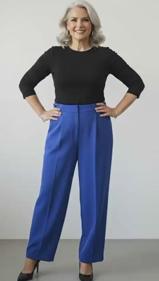 Pantaloni eleganți, cu talie înaltă, croială dreaptă spre ușor evazată, care alungește silueta și oferă un aer rafinat. Realizați dintr-un material fluid, plăcut la atingere, ce cade frumos pe picior și asigură confort pe tot parcursul zilei. Detaliul cu nasturi decorativi în lateral adaugă un accent chic și modern.
