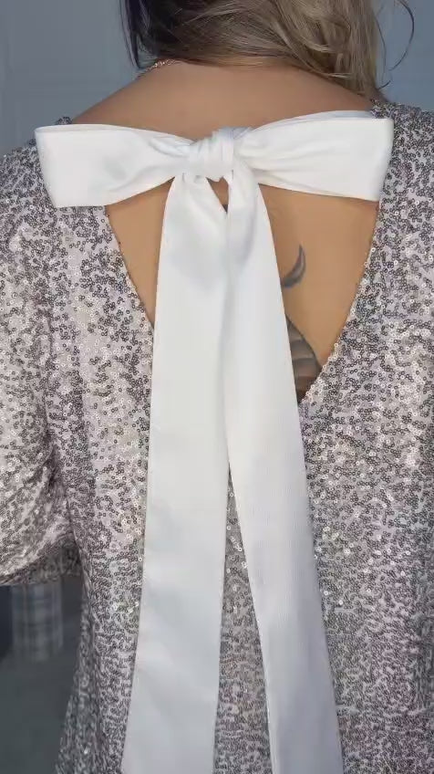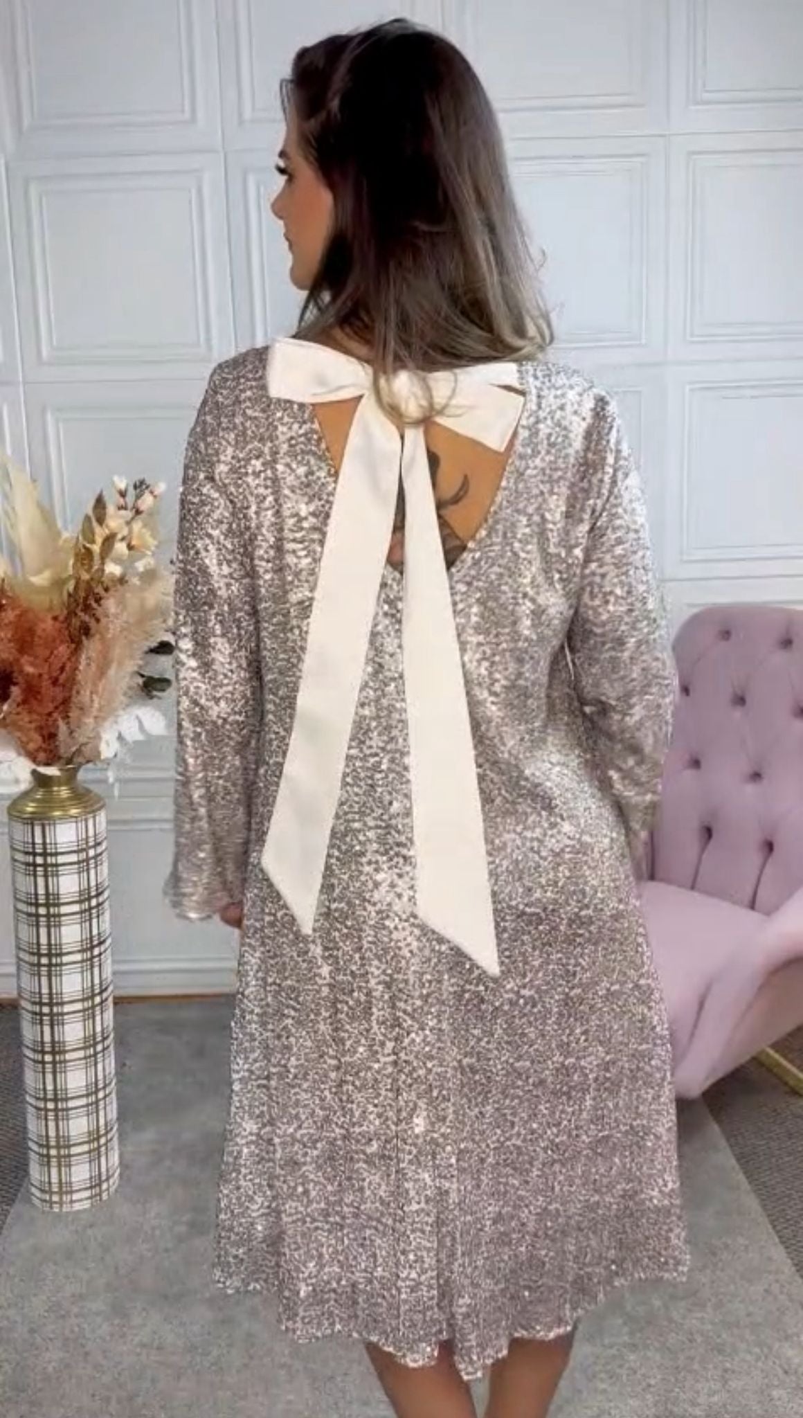Rochie eleganta din paiete, tip clopot cu funda spectaculoasa in zona umerilor. Este perfecta pentru orice tip de eveniment. Avantajeaza orice silueta.