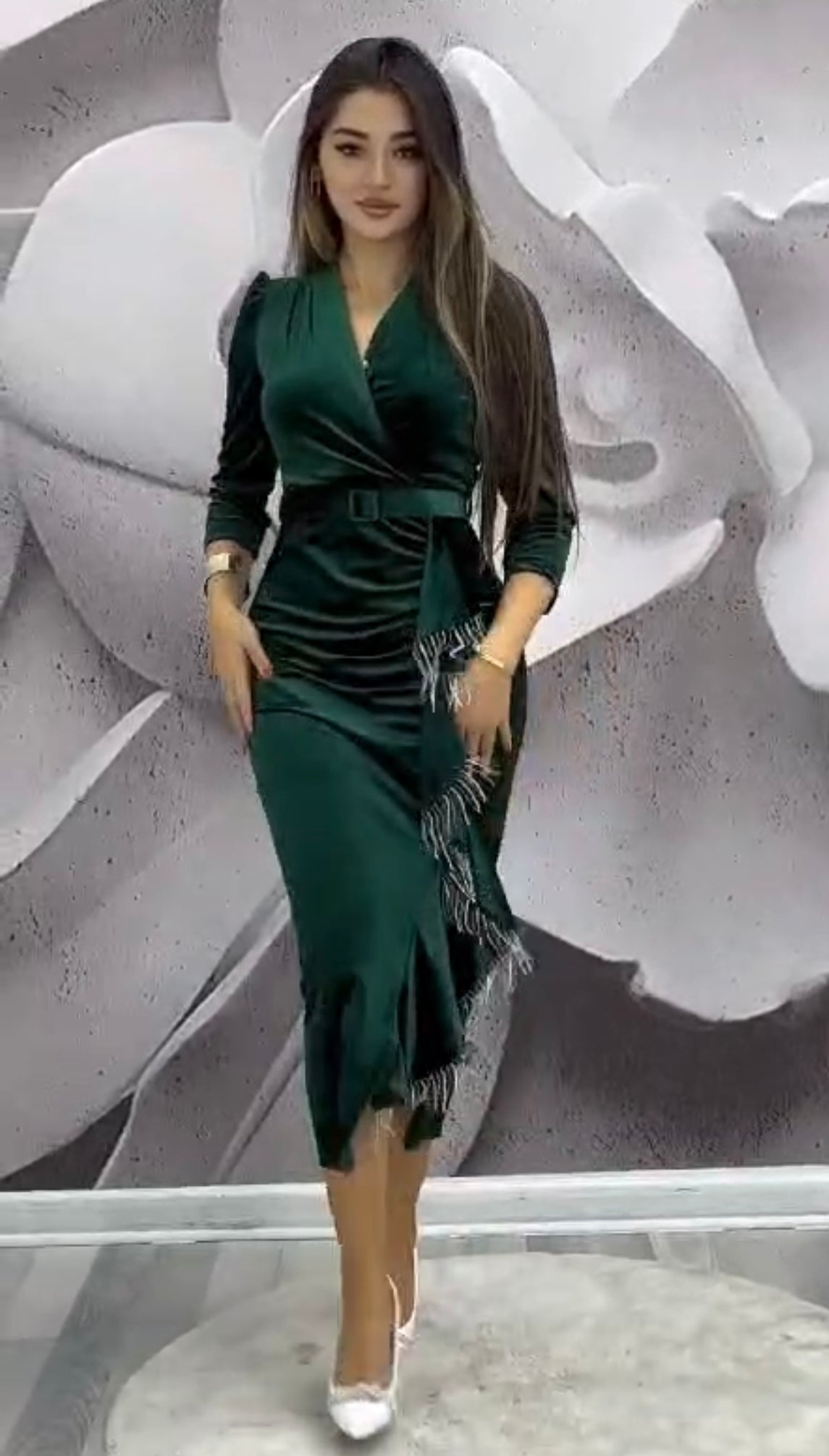 Rochie eleganta din catifea, parte peste parte si volan cu franjuri metalici. O rochie ideala pentru orice tip de eveniment!