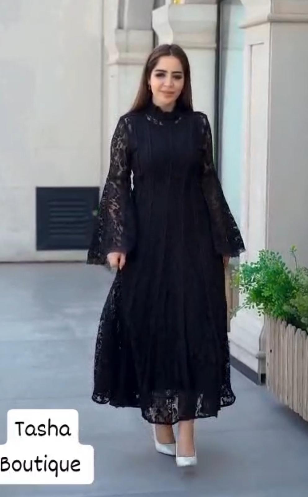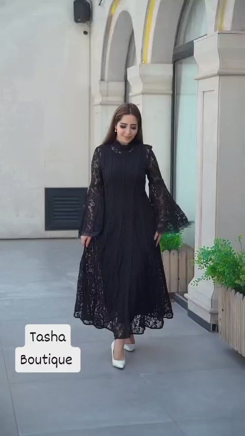 Rochie eleganta din dantela cu fusta ampla si maneca lunga cu volan. Este o rochie potrivita pentru orice ocazie.