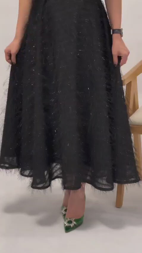 Rochie eleganta cu fusta ampla si bust cu volane, realizata dintr-un material cu un fir special usor lucios, ce da senzatia de plutire . Este o rochie potrivita pentru orice ocazie.