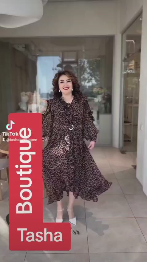 Rochie eleganta cu fusta ampla si volane, maneci spectaculoase cu insertie de tulle si suprapunere simetrica in zona bustului. Este o rochie potrivita pentru orice ocazie.