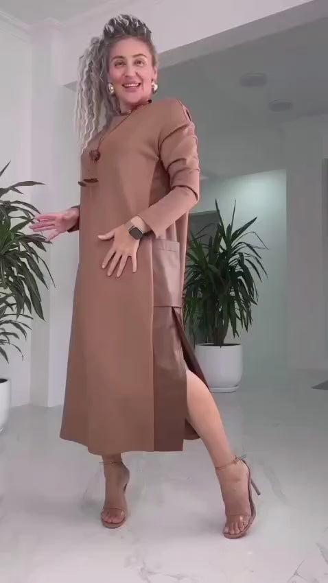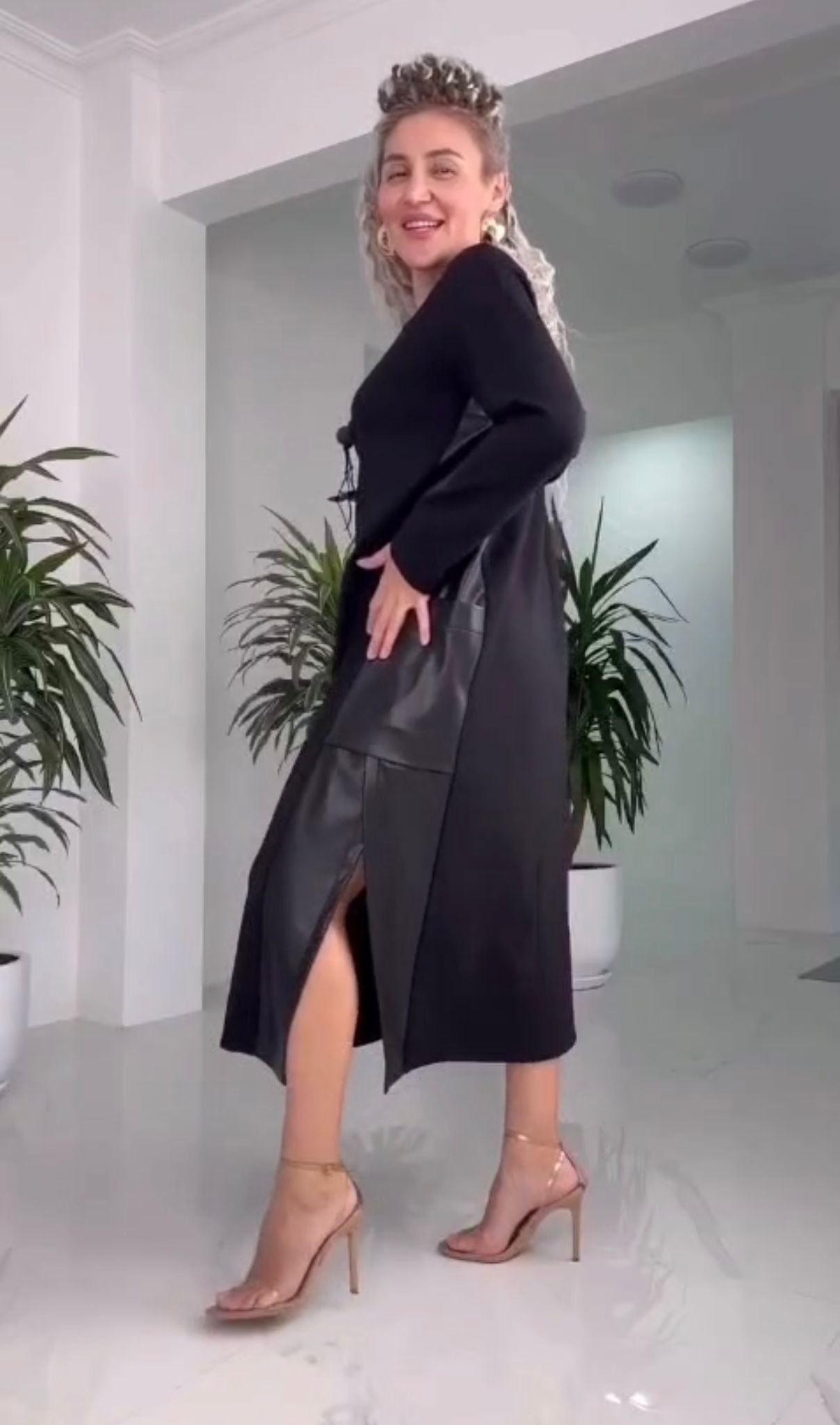 Rochie casual din scafandru cu buzunare laterale si insertie din piele ecologica. O rochie perfecta pentru o tinuta de zi sau de birou! Accesoriul nu este inclus!