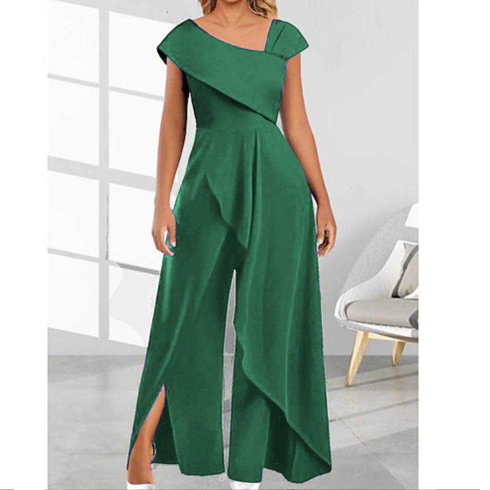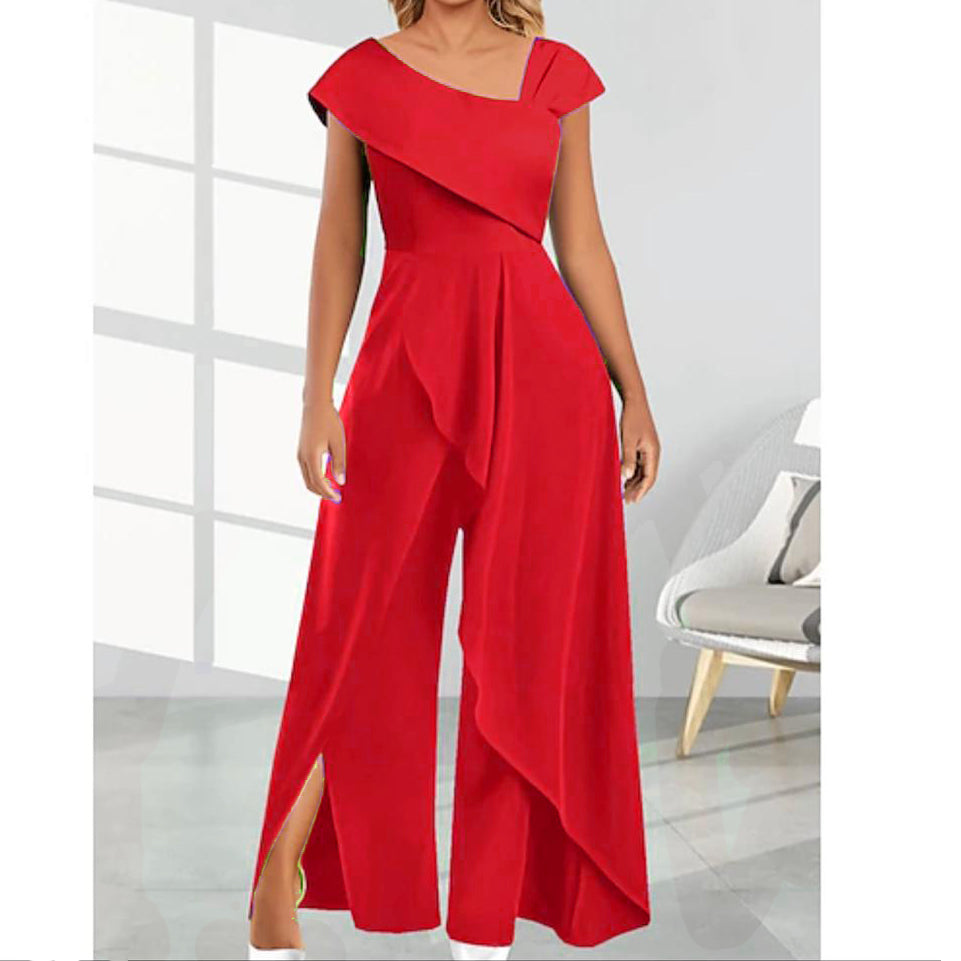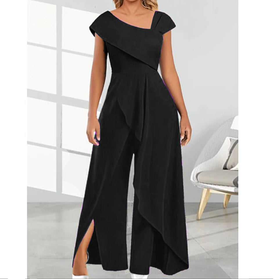 Salopeta eleganta, perfecta pentru orice tip de eveniment. Bust asimetric si pantalon larg cu crapatura pe lateral si peplum lung asimetric.